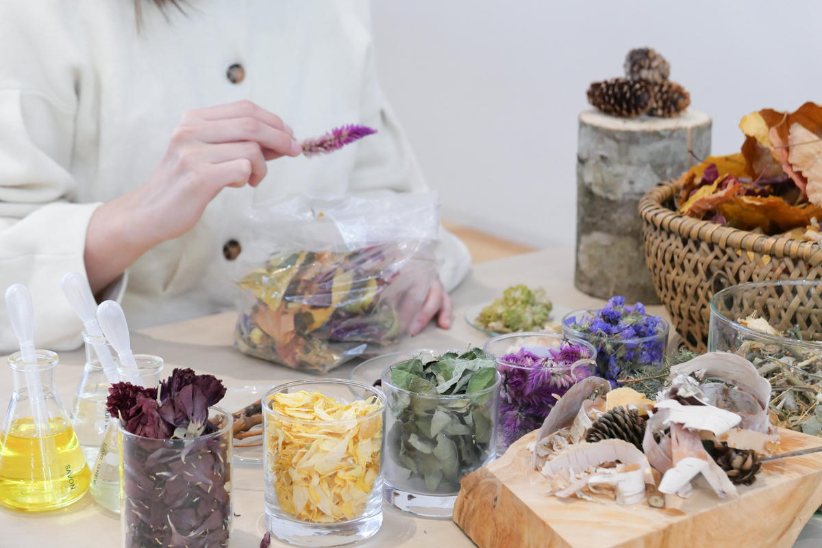 色や香りを選びながら手を動かし、少しずつ組み合わせていくことで、世界にひとつだけのポプリへと仕上げていきます。完成したポプリは、お部屋に飾るなど、暮らしの中で香りと彩りをお楽しみいただけます。