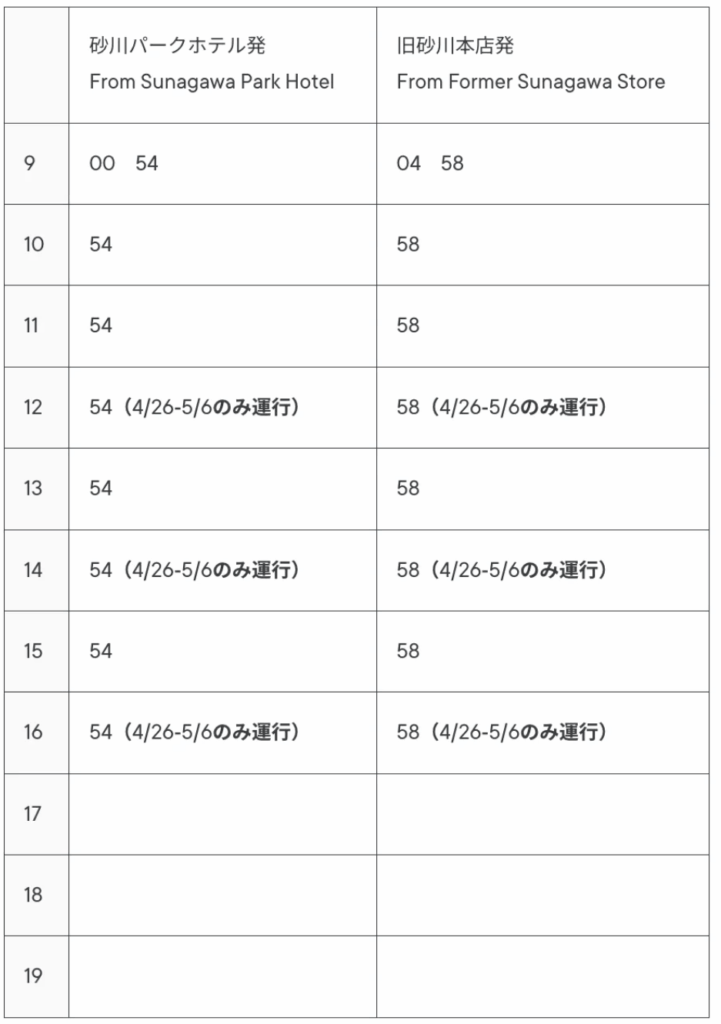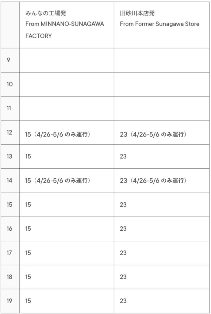 なお、「砂川パークホテル」と「みんなの工場」間で運行しております無料シャトルバスは、期間中は、5便増やしての運行となりますので、以下にてご確認ください。