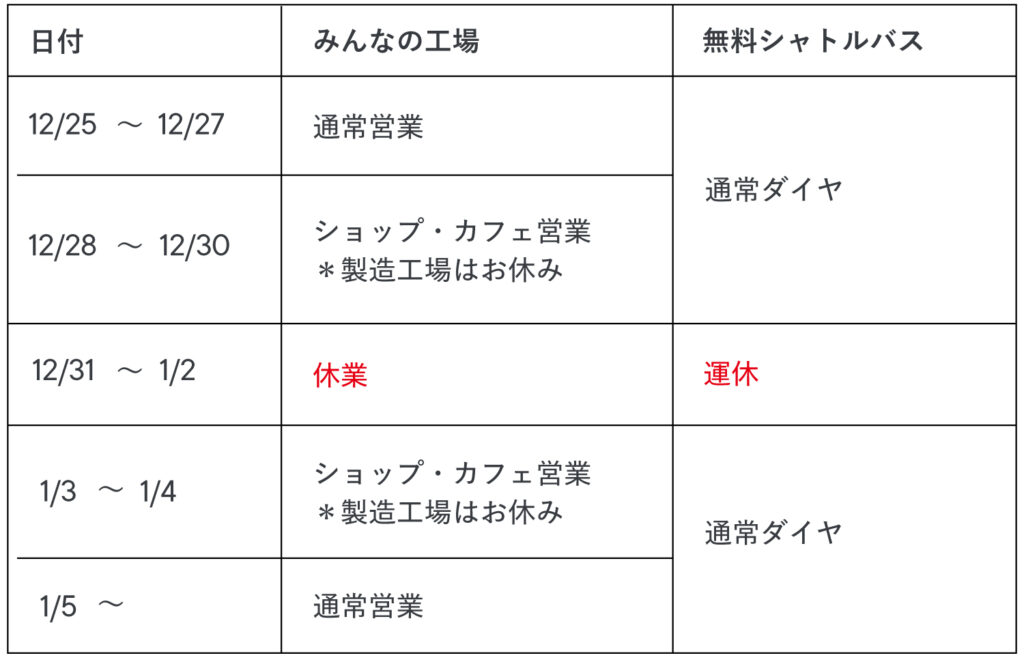 ショップ、カフェを含む「みんなの工場」の施設全体は12月31日(水)〜1月2日(金)の期間、休業いたします。